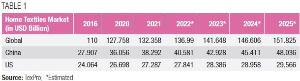 The global home textiles market is estimated at $137 billion in 2022, growing at a CAGR of 3.8 per cent between 2016 and 2021. With an average growth of 3.5 per cent per annum it is projected to reach $152 billion in 2025. China and the US respectively account for approximately 29 per cent and 20 per cent share of this market, of which China is expected to grow at faster CAGR of close to 6 per cent between 2022 and 2025. China’s share in global textiles market is expected to rise from 25.4 per cent in 2016 to 31.6 per cent in 2025 while the share of the US is likely to decrease from 21.9 per cent to 19.5 per cent during the same period despite growing in value terms, according to Fibre2Fashion’s market insight tool TexPro. In terms of consumption, the US and Europe are the biggest consumers constituting around 60 per cent of the global home textile imports. On the supply side, countries like India, China and Pakistan stand as the key suppliers.