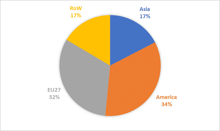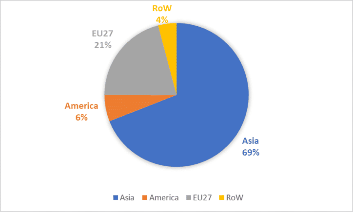 The global home textiles market can be divided into four regions: Asia, America, the European Union, and the Rest of the World (RoW). A regional analysis of exports shows that Asia holds a 69 per cent share in the global home textiles trade. Europe, North America, and RoW held market shares of 21 per cent, 6 per cent, and 4 per cent respectively in 2021. Globally top ten home textiles exporting countries accounted for more than 80 per cent of the worldwide export in 2021, led by China with a market share of 43 per cent.